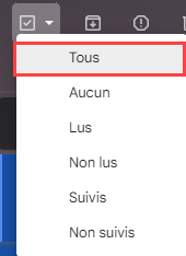 Une fois cela fait, vous avez accès à tous les e-mails que vous n’avez pas encore ouverts. Vérifiez que parmi ceux-ci ne se trouvent pas des e-mails importants. Maintenant que tous les e-mails non-lus apparaissent, cliquez sur la flèche à côté de la case à cocher puis cliquez sur “Tous”.