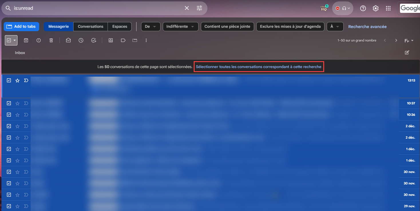 Cela sélectionne tous les e-mails de la page courante. Pour sélectionner tous les e-mails non-lus de toutes les pages, cliquez sur le texte “Sélectionner toutes les conversations correspondant à cette recherche”.